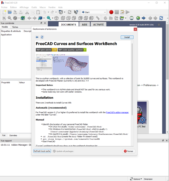 Montage de l'atelier Curves⚓Cliquer Install pour exécuter l'installation.⚓FreeCAD vous demandera de le redémarrer après l'installation.