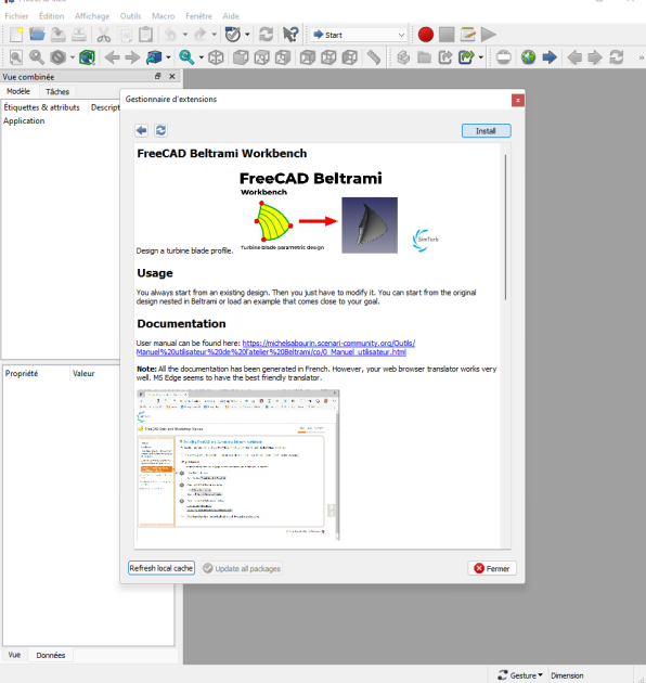 Installation automatique de l'ateliler Beltrami⚓Cliquer Install pour exécuter l'installation.⚓FreeCAD vous demandera de le redémarrer après l'installation.