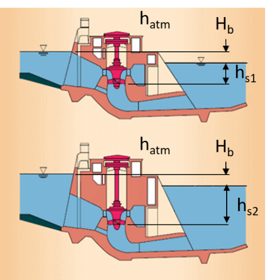 Dans une turbine hydraulique, la pression statique la plus faible est obtenue à la roue où on trouve une vitesse élevée. Généralement c'est près du bas des aubes sur les Francis et à l'axe roue sur les Kaplan.