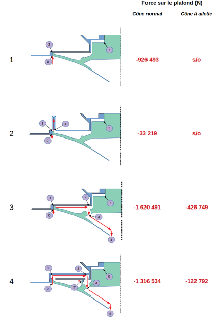 La configuration 3 montre que le cône à ailette a un effet remarquable. De fait, la configuration 4 avec le retour de la fuite par des canaux dans le fond supérieur diminue aussi les effets de centrifugation presque sur tout le plafond et devient très compétitive avec la configuration 2 en terme de poussée.