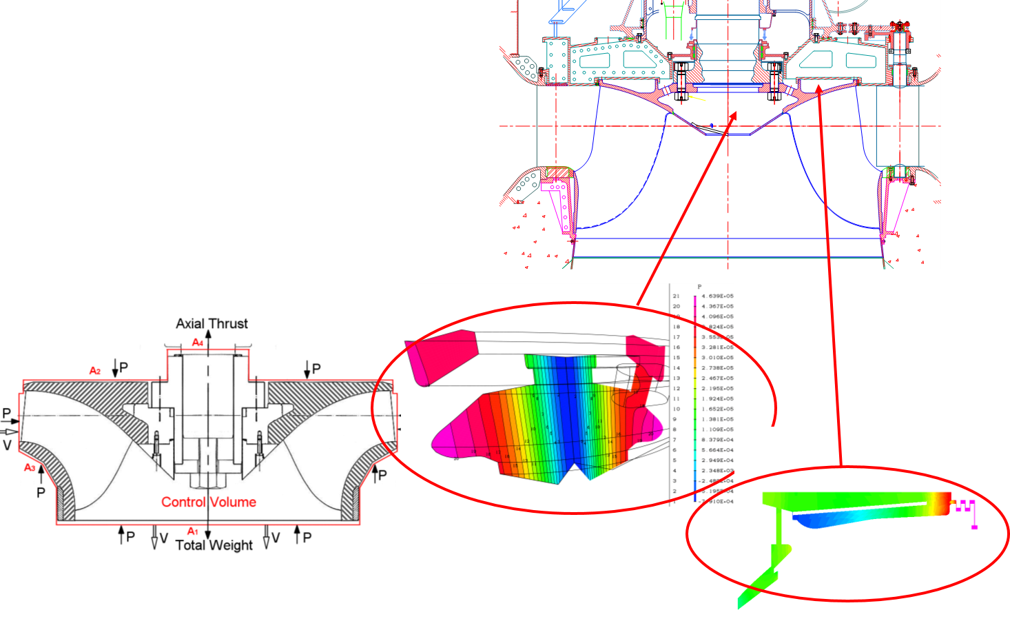 La configuration de la région des parties supérieures de la turbine Francis peut avoir d'importants effets sur la poussée axiale.