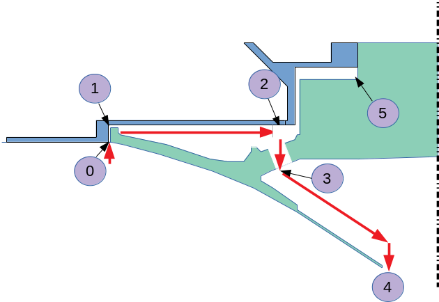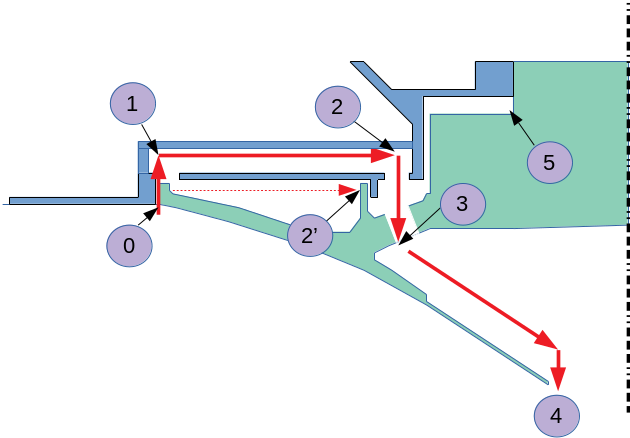 Cette configuration permet la fuite au labyrinthe grâce à des trous d'équilibrage au point 3 qui relient le dessus du plafond à l'aval des aubes de la roue par la pointe conique de la roue[11]. L'écoulement au point 1 a acquis une vitesse de rotation située entre 0 et la vitesse tangentielle de la face du labyrinthe de la roue, elle devrait être très près de la moitié de la vitesse tangentielle de la face du labyrinthe de roue. Par conservation du moment cinétique la vitesse de rotation entre 1 et 2 suivra une loi de proportion r1 sur r. Arrivée à 3, la vitesse tangentielle de l'écoulement est celle de la roue à cet endroit. Entre 3 et 4 par conservation du moment cinétique la vitesse de rotation suit une loi de proportion r3 sur r. La vitesse de rotation entre 2 et 5 se situe entre 0 et la vitesse de la roue.