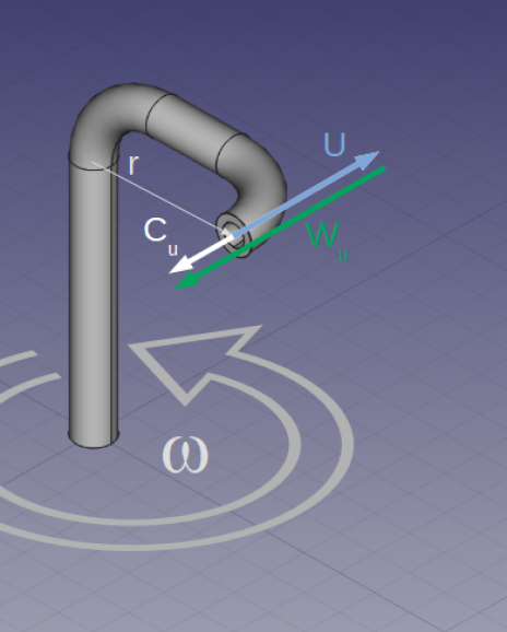 Comme on l'a vu, la force résulte d'un changement de direction axiale, à l'entrée, vers une direction tangentielle, à la sortie. Cet effort crée un couple qui à cause de la vitesse angulaire donne une puissance. Cette puissance est en fait le produit d'un débit massique par une énergie massique .