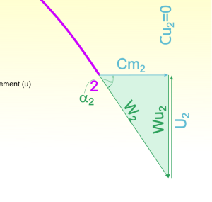 On a ainsi : la vitesse tangentielle du fluide à la sortie \(Cu_2=0\) et l'angle de l'écoulement dans le repère absolu \(\gamma_2=0\). La vitesse absolue \(C_2\) y est donc la vitesse débitante \(Cm_2\).