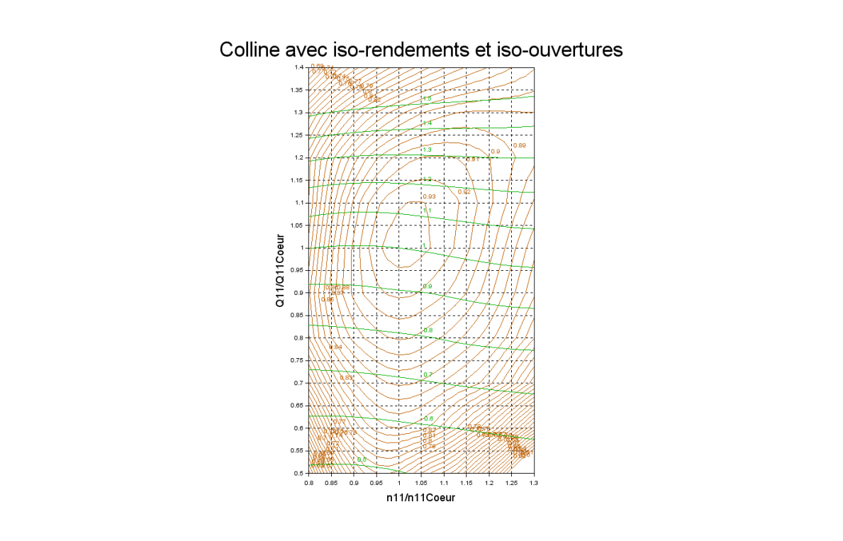 Si l'information dont on dispose est graphique, il faudra prendre quelque dispositions additionnelles pour s'assurer d'une représentation globale suffisamment précise. Ainsi, il faut s'assurer de la régularité des iso-contours que ce soit ceux du rendement, ceux des ouvertures ou ceux du débit. Pour cela le script CollineGrille.sce est l'outil idéal. Il faut dans un premier temps s'assurer que le pas de la grille soit suffisamment fin pour les coordonnées x et y. Ensuite, en fonction de l'allure des iso-contours corriger les erreurs de lecture et ajouter des points aux endroits qui manquent de définition.