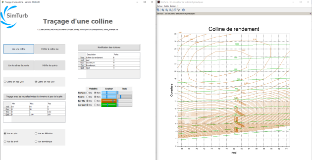 La colline de rendement est une représentation graphique de la performance de la turbine. Un présentation du fonctionnement de la turbine se trouve ici. Habituellement, la colline s'appuie sur 2 axes liés au débit et à la chute pour représenter sur une troisième dimension certaines valeurs qui peuvent être le rendement, la puissance, des limites liées à des phénomènes physique comme la cavitation, la torche, les vortex de charge partielle ou tout simplement les limites d'opération prévues par l'exploitant.