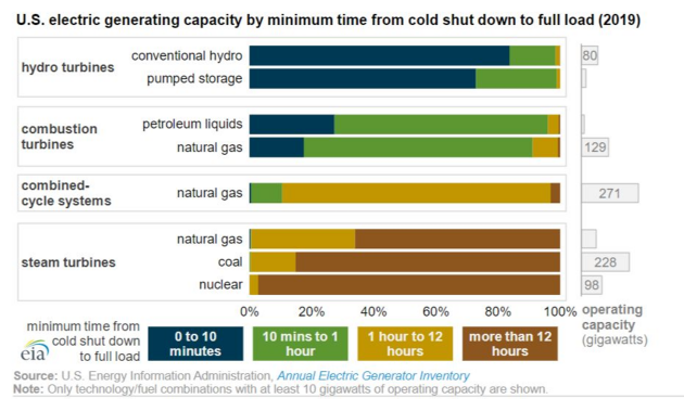 Sur le graphe suivant, les statistiques sur les délais de démarrage montrent clairement l'avantage de l'hydroélectricité sur les autres sources d'énergie.