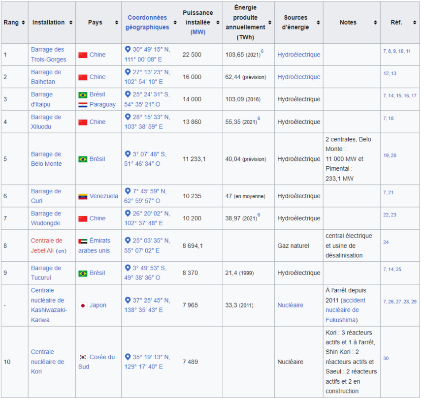 De fait, toute source d'énergie confondue, les plus puissantes centrales sont hydrauliques :