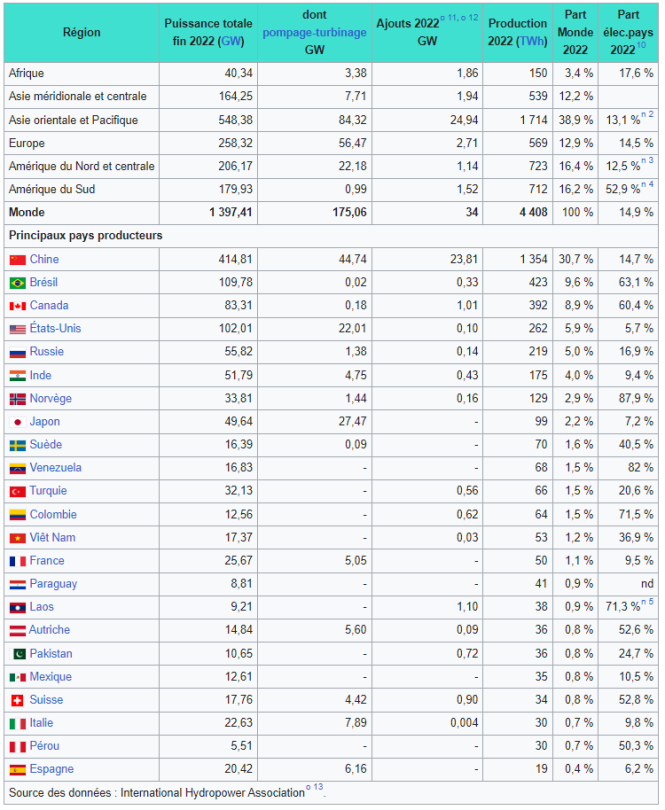 1267 GW de puissance installée en 2022 incluant 175GW en pompage-turbinage pour une production totale de 4 408 TWh.[4]