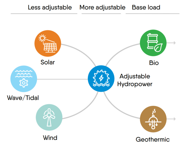 Par sa flexibilité d'exploitation due aux grands réservoirs et aux installation de pompage-turbinage, l'hydroélectricité facilite la gestion du réseau en permettant d'accepter des modes de production constants comme le thermique et le nucléaire et des modes de production intermittents comme l'éolien et le solaire.