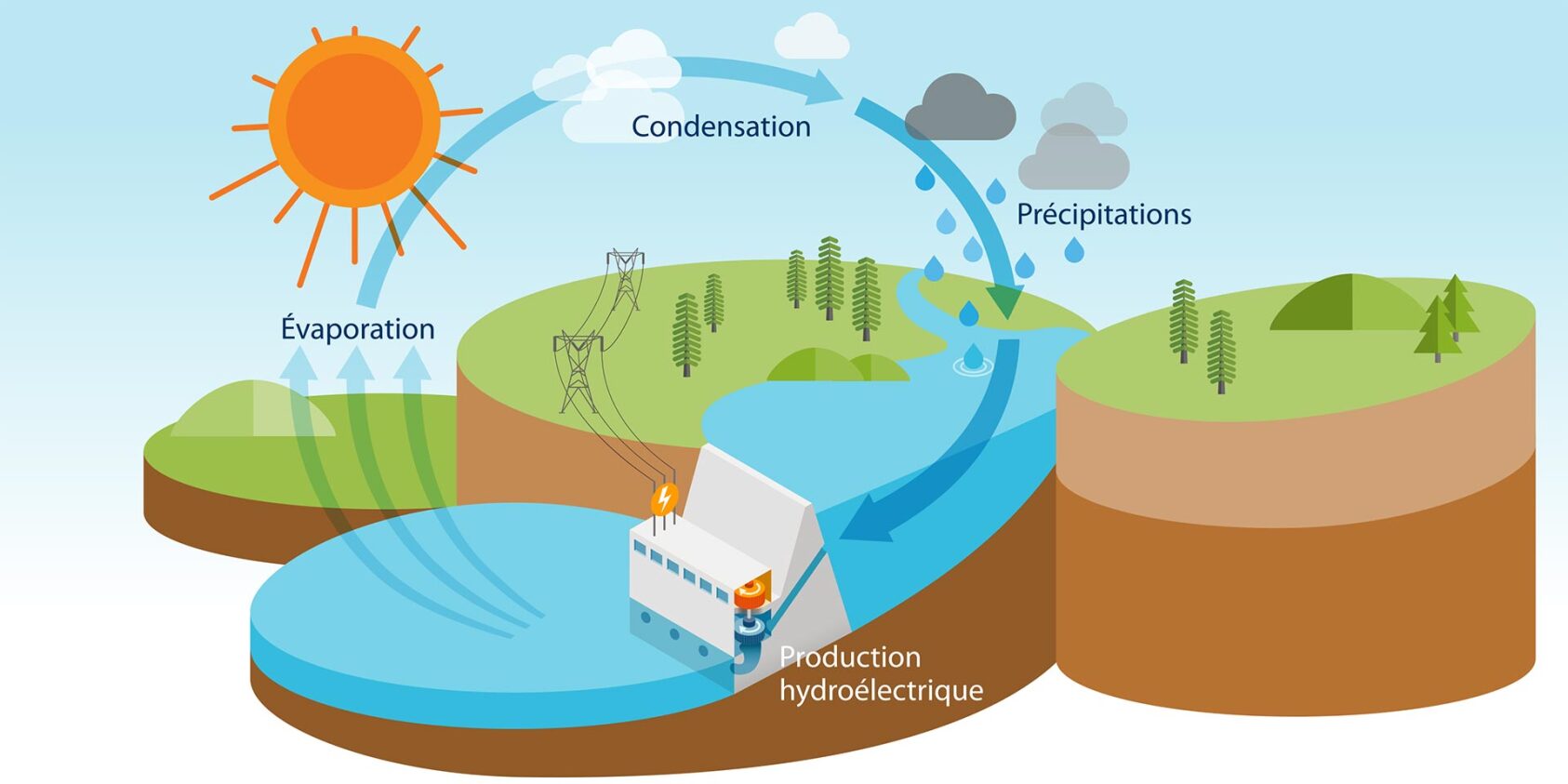 L'énergie hydraulique est en fait une manifestation de l'énergie solaire. Dans le cycle de l'eau, le soleil évapore l'eau à la surface du globe. Les nuages sont constitués d'un équilibre entre la condensation et l'évaporation. Lorsque cet équilibre est rompu, la pluie dépose une partie de l'eau sur les plateaux terrestres qui sont en altitude par rapport au niveau de la mer. En altitude l'eau a une énergie potentielle qui se transforme en énergie cinétique lorsqu'elle est mise en mouvement. Si elle n'est pas captée par les turbines hydrauliques, cette énergie se transforme en chaleur dans la turbulence et se dissipe dans l'environnement. Pour fixer les idées, s'il n'y avait pas d'échange de chaleur avec l'environnement, l'énergie dissipée pour une chute de 100 m ferait monter la température de l'eau de 0,2 degré Celcius. C'est cette énergie qu'on souhaite transformer en électricité. [2]