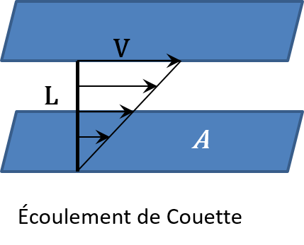 Pour les système 1 et 2 : \(F'=\mu' A' {{d V'} \over {d y'}}\) et \(F''=\mu'' A'' {{d V''} \over {d y''}}\) .