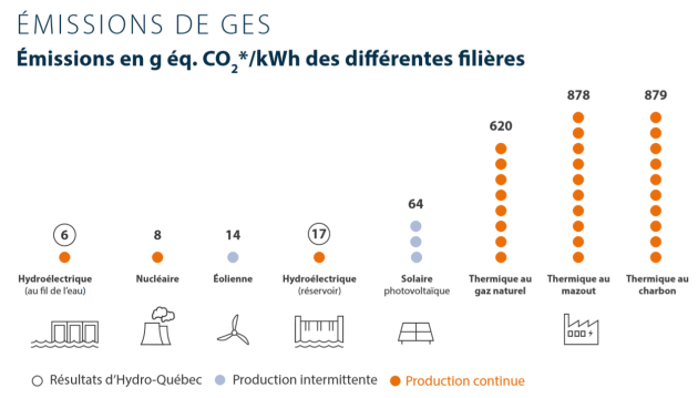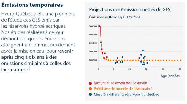 « Toutes les filières de production d'électricité produisent des gaz à effet de serre (GES) au cours de leur cycle de vie (construction, exploitation et déclassement). L'hydroélectricité produit surtout du dioxyde de carbone et, dans une moindre mesure, du méthane, résultat de la dégradation de la matière organique ennoyée. Sur l'ensemble du cycle de vie, les émissions nettes de GES des centrales hydroélectriques québécoises sont similaires à celles des éoliennes, et sont beaucoup plus faibles que celles des centrales au gaz naturel ou au charbon.