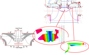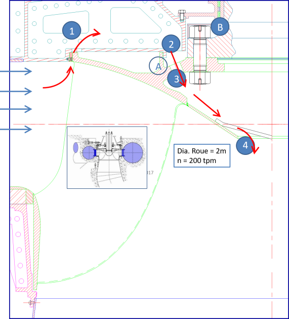 Sur la figure suivante, on représente les parties supérieures de la turbine avec un cheminement typique de la fuite et en médaillon une coupe turbine.