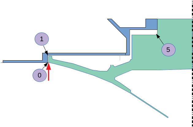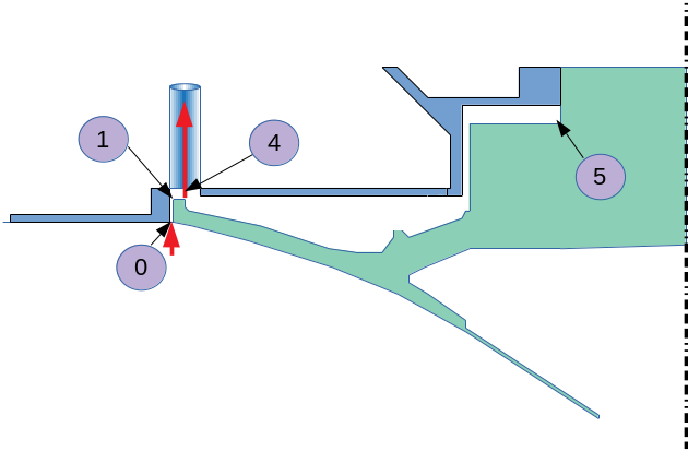Cette configuration permet la fuite. Un conduit relie le point 1 au point 4 à l'aval. La fuite au labyrinthe est donc conditionnée par la pression où débouche ce conduit au point 4. La pression entre 1 et 5 est centrifugée à une vitesse de rotation du fluide qui doit être entre la vitesse de rotation de la roue et la vitesse nulle du plafond.