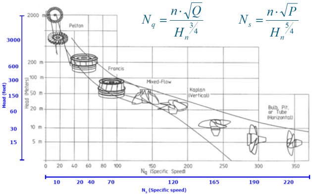 • La vitesse spécifique permet de classer les turbines sur la base de leur chute, débit et vitesse de rotation. Pour une turbine donnée, elle se calcule généralement au point de pleine charge mais aussi au point de meilleur rendement.