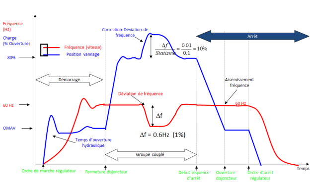 Lors de l'arrêt normal, l'asservissement au réseau maintien la vitesse synchrone, la fermeture des directrices coupe le débit et réduit le couple et donc la puissance générée jusqu'à l'ouverture de marche à vide où on se retrouve en emballement à la vitesse synchrone et donc avec aucune puissance électrique produite.