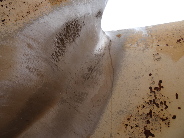 Il s'agit du type de cavitation le plus agressif et dommageable pour les roues. Sur la vue suivante, le photographe se trouve entre les aubes et photographie vers l'amont l'intersection de l'extrados de l'aubage avec la ceinture. On y voit que la cavitation se produit à la fois sur l'extrados et dans le congé. Dans ce cas, il s'agit du résultat d'une correction. Pour corriger le problème, on a conçu un congé plus grand qui tend localement à étaler les zones à grande vitesse sur de plus grande surface pour en diminuer l'intensité. Cette situation quoique grandement meilleure qu'avant la modification n'est évidemment pas entièrement satisfaisante.