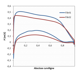 Sur le graphique suivant on représente pour deux filets voisin de la ceinture le champ de pression le long de l'abscisse curviligne. On y voit bien que la pression absolue plonge à l'entrée de façon très pointue. C'est cette dépression qui cause la cavitation d'entrée.
