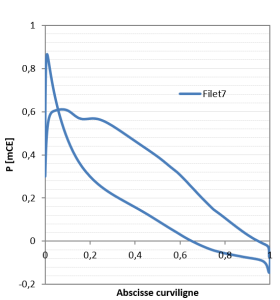 Sur le graphique suivant, on peut apercevoir la dépression à l'entrée intrados sur un filet fluide à mis chemin entre la ceinture et le plafond.