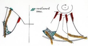 Sur la figure suivante, on voit qu'en fait deux structures tourbillonnaires sont représentées. La jaune est la plus volumineuse et peut créer des usures qui peuvent être confondues avec de la cavitation de sortie. Son point de départ au plafond peut laisser des trace d'usure qui ne sont pas inquiétantes en soi. La structure rouge résulte du décollement d'entrée de la "pompe", son point de fixation au plafond peut aussi montrer des usures.