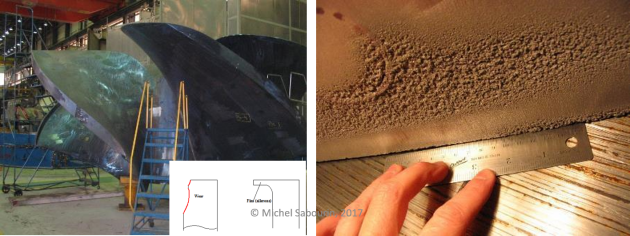 Sur la figure suivante, à gauche on illustre la lèvre anti-cavitation et son implantation sur une hélice et à droite, on observe les usures créées par cette cavitation sur une pale sans lèvre.