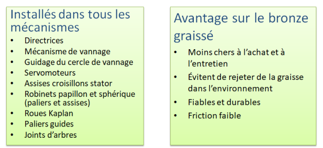 La graisse est aussi utilisée pour les joints du mécanisme de vannage et les paliers guides des directrices. Le graissage s'effectue de façon continue et la graisse ainsi consommée se trouve en grande partie libérée dans l'eau. C'est une source de pollution importante.