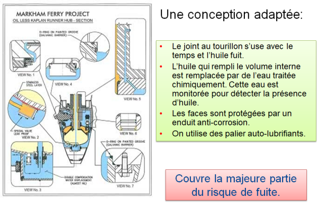Toutefois, dans les roues de type Kaplan, le moyeu est rempli d'huile et il peut y avoir une fuite au joint entre les tourillons de pales et le moyeu. Sa réparation devient une intervention majeure qui demande l'arrêt du groupe pour une certaine période de temps. Ce risque est le plus important en ce qui concerne l'huile.