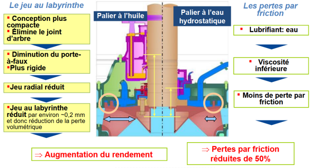 Comme illustré sur la figure suivante, le palier à l'eau, en plus d'éliminer l'huile, présente de nombreux avantages en permettant une conception plus simple, plus rigide et plus efficace.