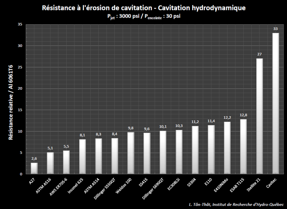 Le mécanisme de résistance s'appuie sur l'effet TRIP (Transformation induced plasticity), c'est-à-dire le changement de phase induit par le travail mécanique qui fait passer l'austénite à la martensite. Il s'en suit une augmentation de volume qui comprime le bout de fissure et résiste à sa propagation. C'est ce mécanisme qui est optimisé avec les matériaux qui ont été conçu pour résister à la cavitation. Une très grande recherche à ce sujet a été menée à l'IREQ par Raynald Simoneau. Cette recherche a abouti à la mise au point de l'alliage Cavitec qui a de très bonne performance en cavitation tout en réduisant sa teneur en cobalt, ce qui en réduit le coût.