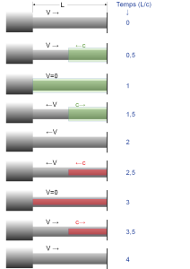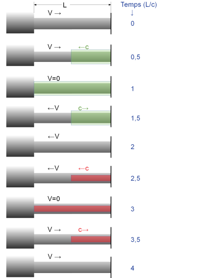 Étudions le phénomène de la réverbération des ondes parcourant la conduite forcée en assumant une longueur L pour la conduite et une célérité c pour les ondes.