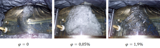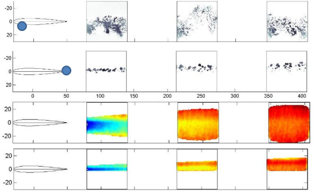 Sur la figure suivante, une étude du point d'injection sur le profil montre qu'une injection près du bord d'attaque montre des bulles plus petites et plus dispersées qu'une injection au bord de fuite.