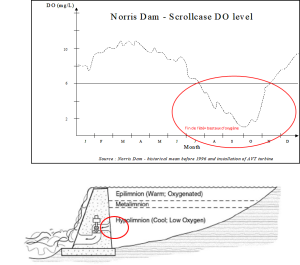 Le problème ne vient pas directement de la turbine mais du barrage qui crée un réservoir où l'eau stagne alors qu'avant le développement hydroélectrique, la turbulence et les courants entraînaient de l'air dans l'eau et favorisait son oxygénation naturellement.