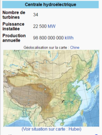 « Les 26 générateurs de 700 MW (fournis par les constructeurs européens allemand Voith, autrichien Andritz et le français Alstom) et les huit générateurs (6 × 700 MW, 2 × 50 MW, construction achevée en 2011) de la centrale ont une puissance installée de 22 500 MW, soit 10 % de la capacité installée en Chine (ou sept fois la capacité des centrales hydroélectriques du Rhône (2 950 MW) ou encore l'équivalent d'une vingtaine de tranches de centrales nucléaires). La hauteur de chute est d'environ 90 m. »
