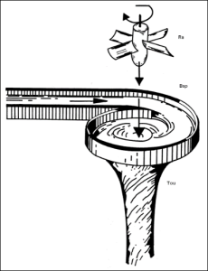 Ce débit massique se déplace radialement. Les vitesses débitante (radiale) et tangentielle sont perpendiculaires. À cause du transit radial, il y a conservation du moment cinétique.