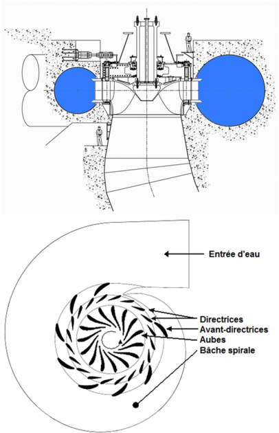 Pour les turbines de faible chute, la bâche est de type fronto-spirale ou n'existe pas. | Informations[2]