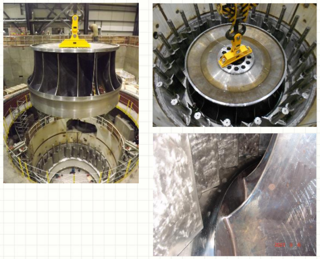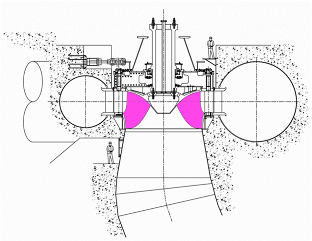 La roue transforme l'énergie hydraulique en énergie mécanique. L'énergie hydraulique transformée résulte de la déviation de l'eau et donc de la réduction de la vitesse tangentielle entre l'entrée et la sortie de la roue.