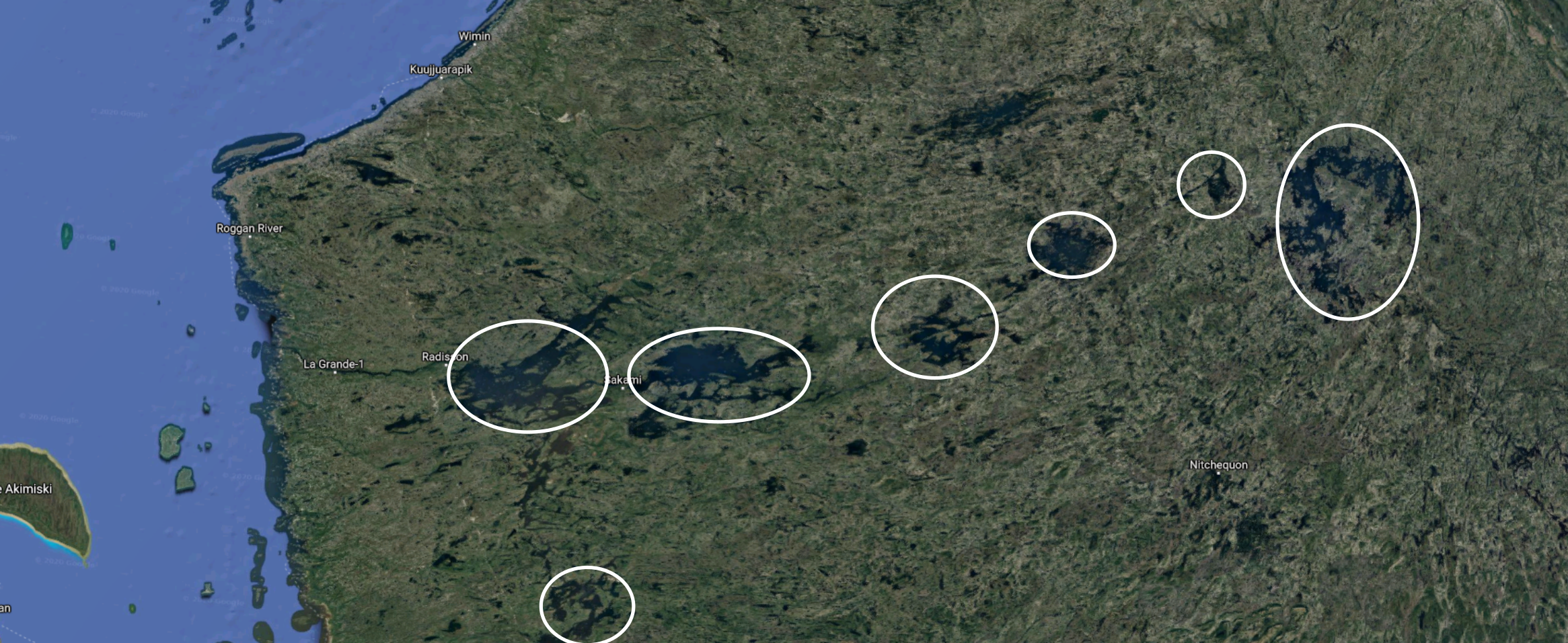 Les réservoirs créés par le projet de la Baie James couvrent un territoire qui se mesure en centaines de kilomètres