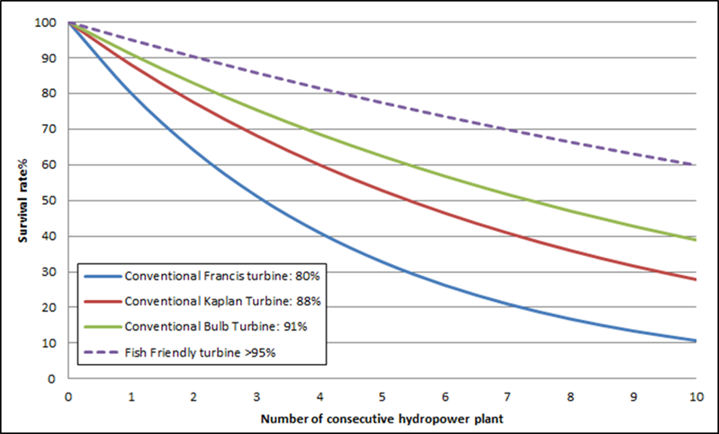 Taux théorique de survie comparé en fonction du nombre de barrages franchis et du type de turbine.