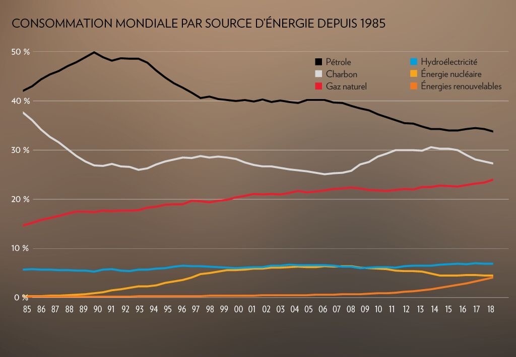 Consommation d'électricité mondiale par source d'énergie depuis 1985