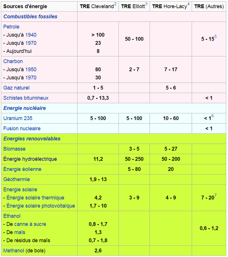 Le Taux de Retour Énergétique selon certaines sources citées par Wikipédia