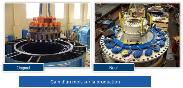 Le nouvel ensemble est beaucoup plus léger (24100 lbs) car il comporte des directrices neuves en CA6NM, un flasque supérieur plus simple, et un palier hydrostatique.